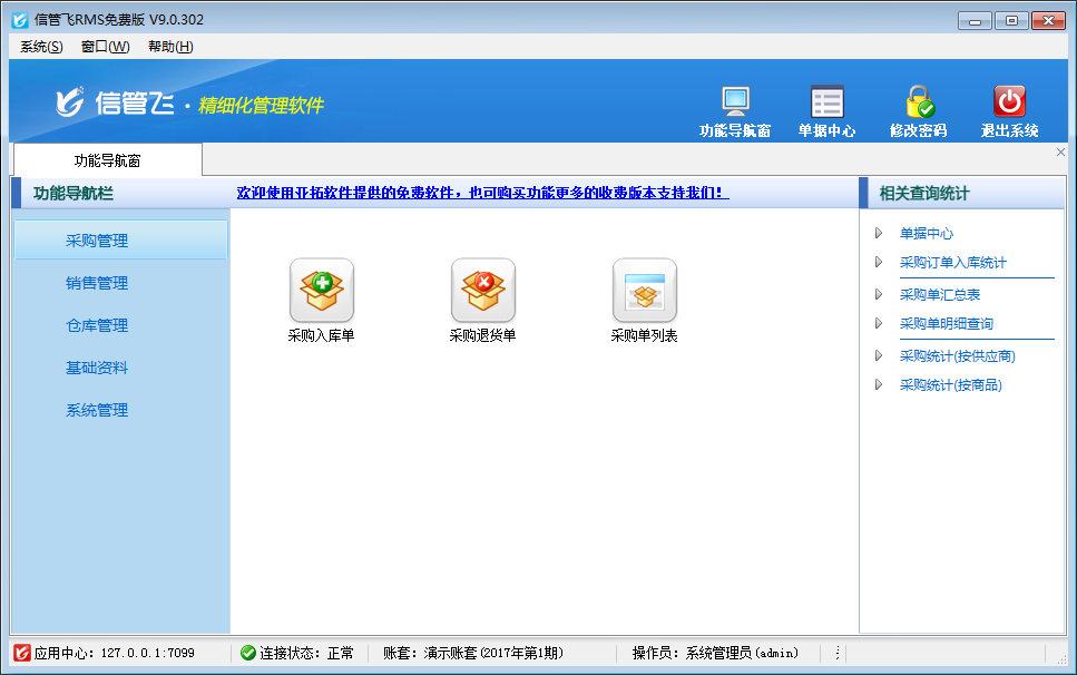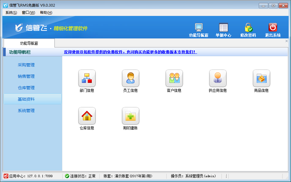 信管飞RMS免费版是亚拓软件开发的一款功能简单、实用的入门级进销存软件,软件主要包括采购管理、销售管理、仓库管理功能,可以方便的管理业务和仓库库存。软件运行稳定、数据安全可靠,并可在业务发展壮大时,升级到收费版本的亚拓管理软件。软件永久免费,软件中提供的功能永久使用,没有功能和数量限制。