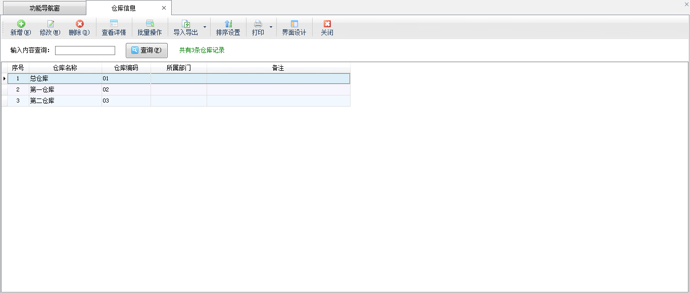 在功能导航窗点击“基础资料”—》“仓库信息”,即可进入仓库信息管理功能,其界面如下图所示: