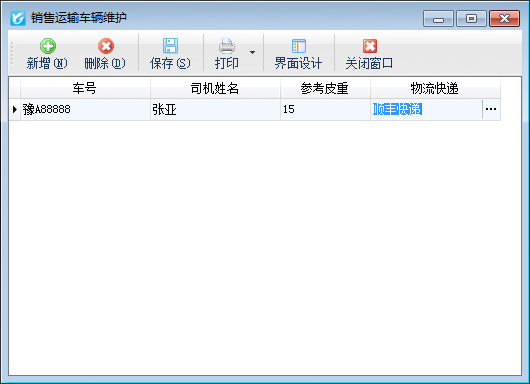 在功能导航窗点击“基础资料”—》“销售运输车辆”,即可进入运输车辆维护功能,可以对运输车辆及其参考皮重、司机姓名、所属物流公司进行维护(有地磅称重管理模块即可使用此功能),其界面如下图所示: