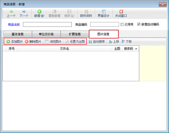 图片信息:新增商品时,可以添加商品图片,对添加的商品图片进行浏览,删除,排序等操作。