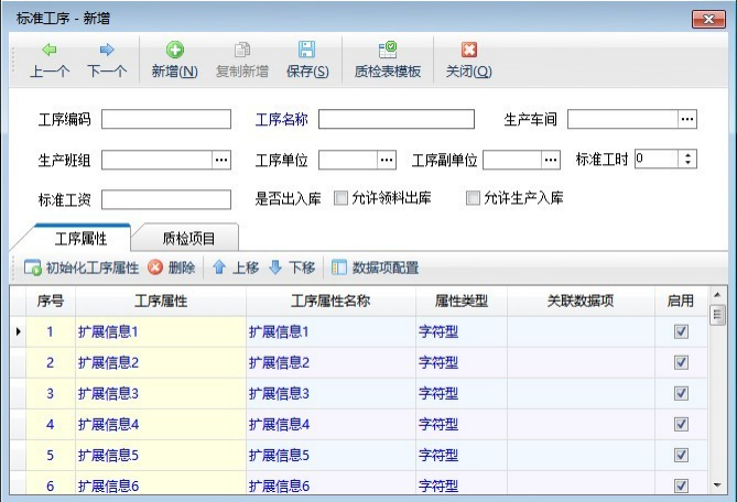 工序属性:选填项,勾选启用多个扩展字段分配不同的工序属性名称、设置属性类型(字符型、数值型、数据字典)可以关联商品编码、商品名称、规格、单位、数量、加工完成量等数据项。