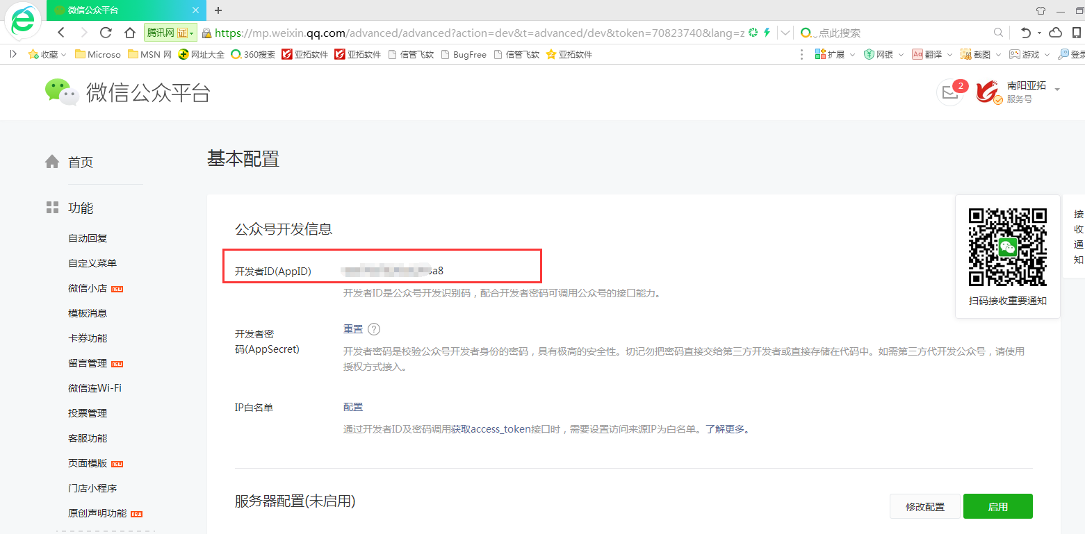 公众号开发者 AppID:登录企业微信公众号,在微信公众平台的首页导航栏下拉到最后,选择开发模块的“基本配置”。在基本配置中复制下“开发者 ID(AppID)”信息。如下图所示: