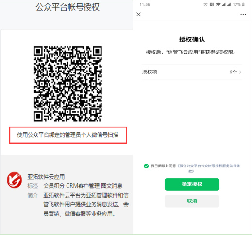 点击“微信公众号授权”会弹出公众平台账号授权二维码。使用公众平台绑定的管理员个人微信号进行扫描。会在手机微信上弹出一个授权确认界面,把微信公众号授权给亚拓软件云应用。如下图所示: