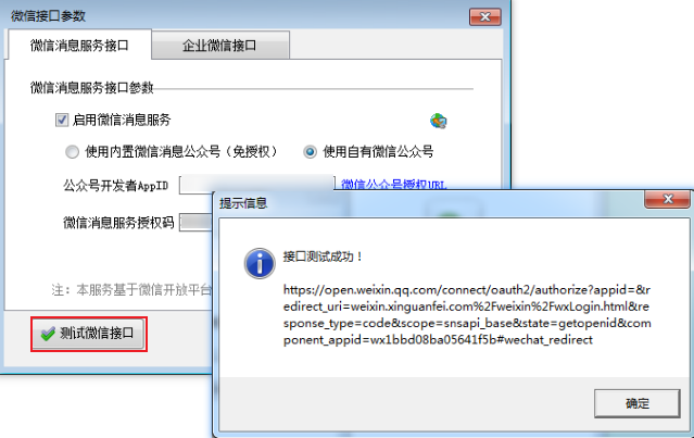 授权成功后,我们会分配微信云服务使用的期限和服务密码。把服务密码复制到微信接口参数中。点击测试接口,提示“接口测试成功”则可以开业务单据推送微信消息。如下图所示: