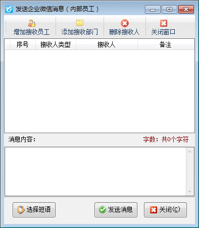 在功能导航窗点击“扩展应用”—》“发送企微消息”可以打开发送企业微信消息窗口,可以编辑消息内容对企业内部员工发送微信企业消息,其界面如下图所示。