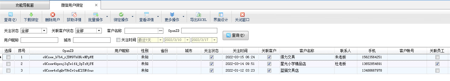 在功能导航窗点击“扩展应用”—》“微信用户绑定”可以打开微信公众号用户管理界面,可以下载绑定微信用户并对其进行关联客户、员工等操作,其界面如下图所示。