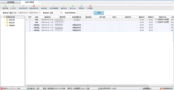 在电话记录管理界面选择通话时间,输入来电号码或者来电人信息查询即可查询到我们所需要的来电信息,选择所需要的来电信息,点击“播放录音”按钮即可播放当前来电的通话自动录音,点“暂停播放”即可暂停正在播放的录音文件。