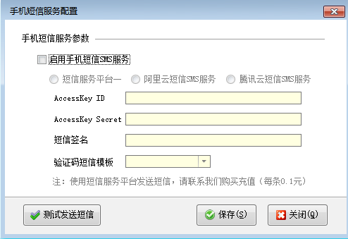 短信配置:在工具栏点击“短信配置”按钮,可启用手机短信服务。支持短信服务平台、阿里云短信SMS服务、腾讯云短信SMS服务。如下图所示: