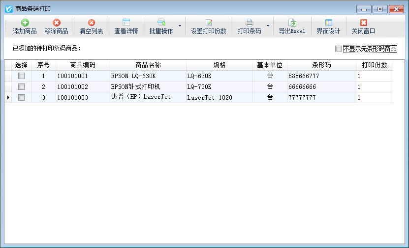 移除商品:在工具栏点击“移除商品”按钮,可以移除已添加到待打印商品列表内的无需打印条形码的商品。