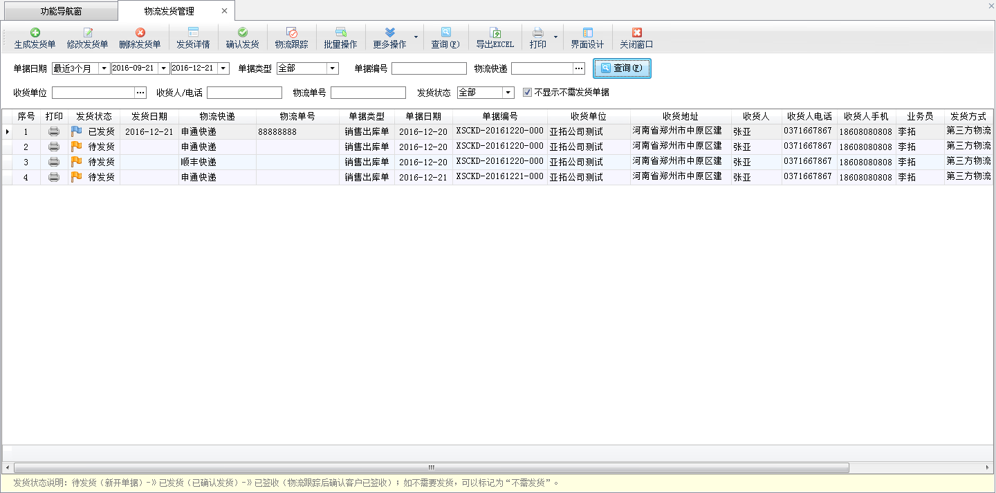 查询:可以根据单据日期、单据类型、单据编号、物流快递、收货单位、收货人、电话、物流单号、发货状态等条件查询发货单。