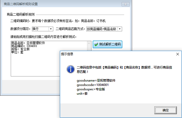 在功能导航窗点击“扩展应用”—》“商品二维码规则”可以设置商品二维码解析规则,其界面如下图所示。