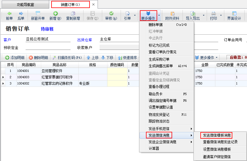 (23)发送企业微信消息:点工具栏中的“更多操作”—》“发送企业微信消息”,可以向业务员发送企业微信消息;点“设置企业微信消息模板”,可以自行设置企业微信通知模板。