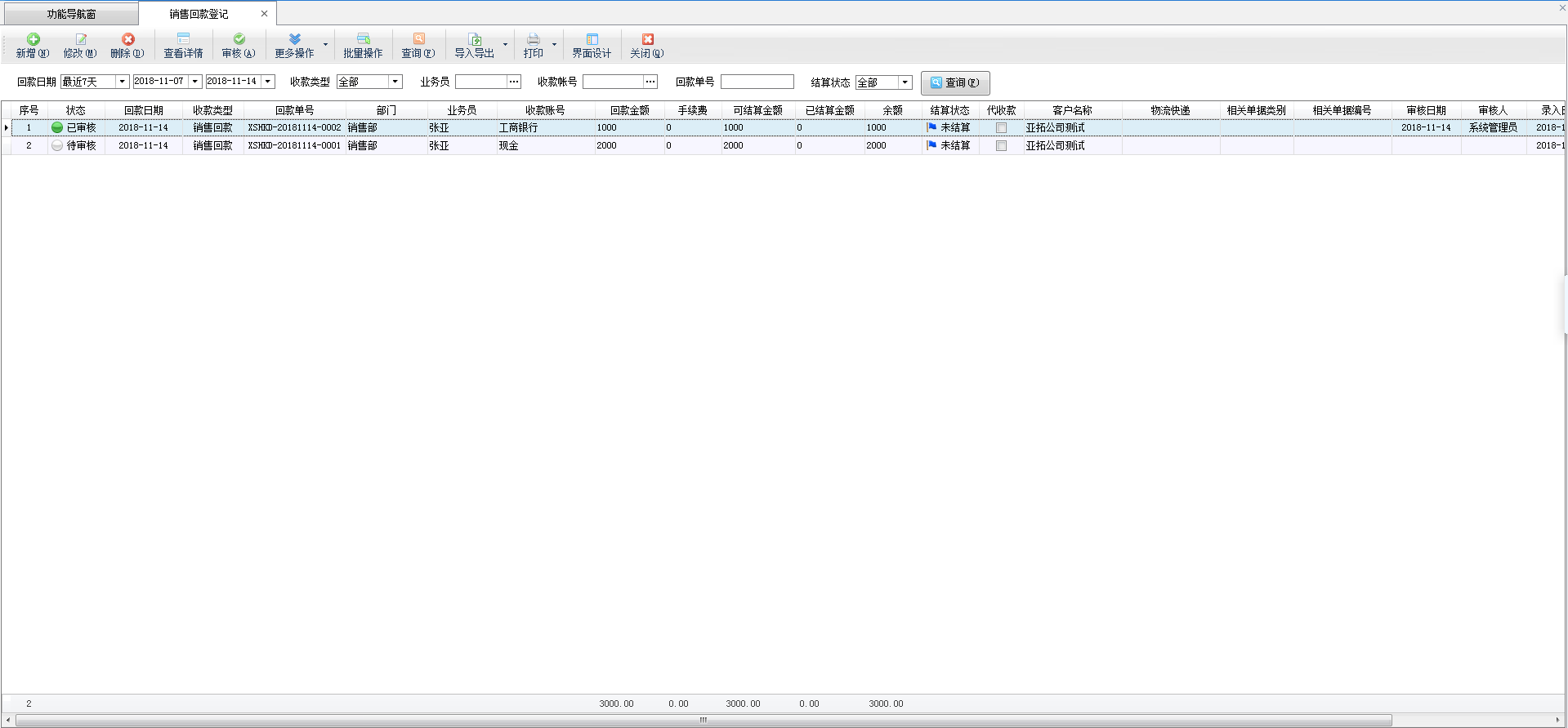 查询:可以根据回款日期、收款类型、业务员、收款账号、回款单号、结算状态等条件查询销售回款单。