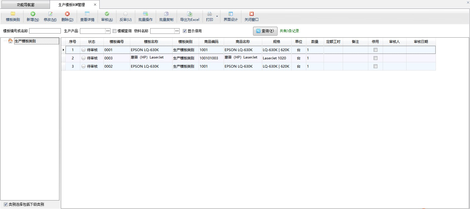 审核:点工具栏中的“审核”按钮,可以对“待审核”的生产模板进行审核,已审核的生产模板不允许随意修改,如需修改清先进行反审。