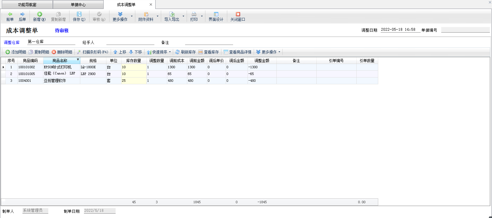 本软件支持负库存开单,如果商品不存在成本价会提示录入成本价,实际工作中有可能会出现录入错成本价的情况,导致最终在仓库库存查询中发现商品成本价异常。此外,在业务经营中也需要进行优惠性调价(节日或促销活动调价)、季节性商品调价、政策性商品调价等。这些业务都可以通过“成本调整单”进行价格调整。