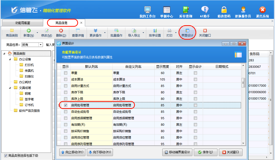 批量启用需在商品信息列表中显示出“启用批号管理”数据项,操作步骤:商品信息列表界面,点击工具栏“界面设计”,勾选数据项“启用批号管理”并保存,如下图所示: