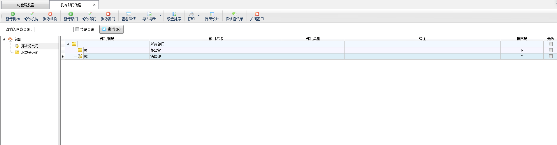 点“新增部门”可以增加新的部门,点“修改部门”可以修改部门信息,点“删除部门”可以删除部门。点“查看详情”可以查看部门信息,查看部门信息窗口默认是只能查看,无法修改的。