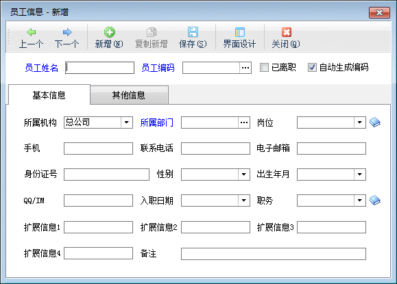 员工编码:必填数据项,如果不填写,则软件会自动根据姓名的拼音头作为编码。