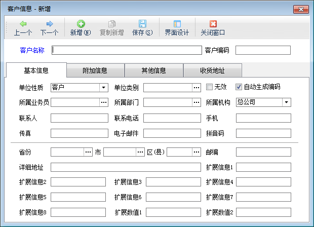 客户资料中除客户名称外,其他数据项可按实际需要选填。