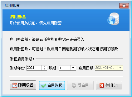 启用账期:是指准备从哪个月份开始使用软件(举例:假设当前月份为2015年4月份,但我们想从2015年2月份开始使用软件,可以将启用账期设置为2015年、账期为2,这样我们需要整理的期初数据就应该是截止到2015-02-01前的期初应收应付款、期初商品库存,开账后就可以录入2015-02-01之后的业务单据)。