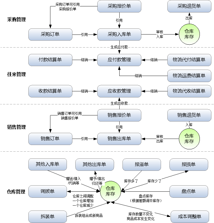 信管飞RMS为进销存、财务一体化管理软件,业务覆盖企业经营管理的方方面面,下图为进销存(采购管理、销售管理、仓库管理、往来管理)的基本流程图:
