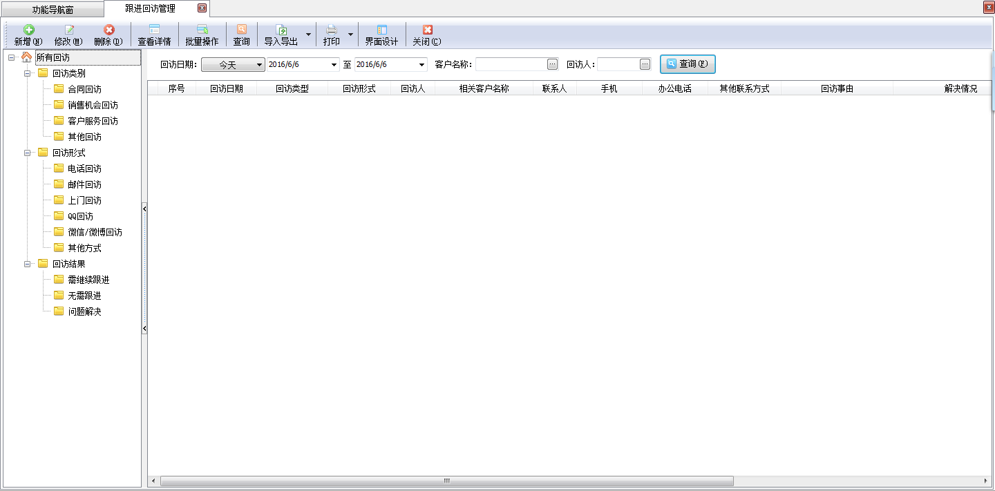 在功能导航窗,点“客户关系”—》“跟踪回访管理”,即可进入跟踪回访界面,如下图所示: