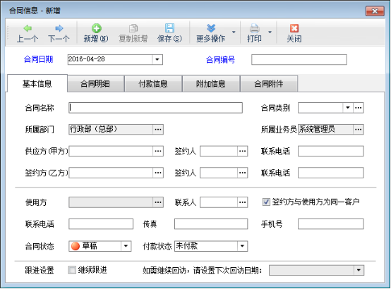 软件支持三方合同,即签约方与使用方不是一家单位(比如渠道代理销售的情况)。合同中涉及的客户信息如果不存在,可以直接录入新客户。