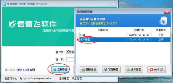 打开云账套登录界面,点击“选择账套”,继续点击下一步进入选择登录账套界面,如下图所示: