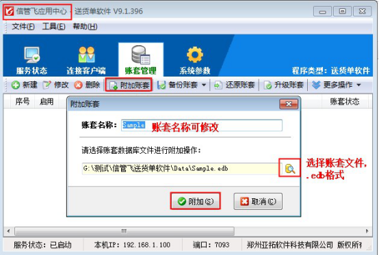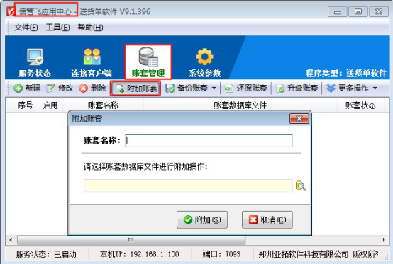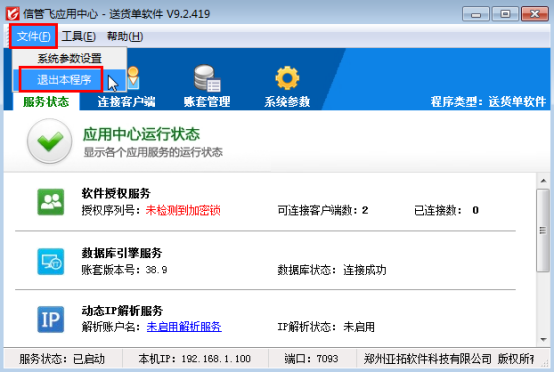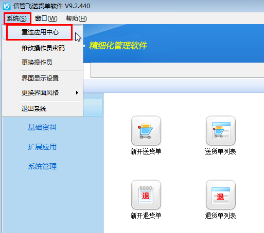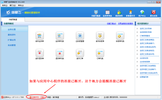 信管飞RMS、信管飞仓库管理软件、信管飞票据打印软件、信管飞出纳记账软件、信管飞送货单软件都包括客户端程序和应用中心程序两个模块,客户端程序登录系统时,应用中心程序是必须打开的。如果主机电脑关机或关闭应用中心程序、程序出现异常等,客户端程序与应用中心的连接就会断开。应用中心程序再次正常运行后,客户端程序需要重新建立与应用中心程序的连接。下面我们以信管飞送货单软件为例介绍一下客户端程序重连应用中心程序的操作方法。