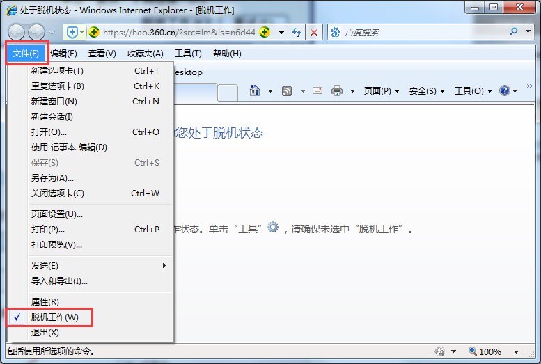 打开IE浏览器,在浏览器菜单栏点击“文件”,然后在文件下拉列表中,可以看到“脱机工作”选项前面有一个“√”,说明当前是已开启脱机工作模式,在此点击将“脱机工作”取消即可。