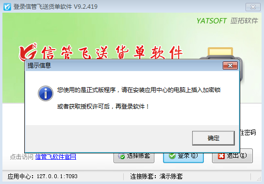 部分用户有时在登录软件时会提示“您使用的是正式版程序,请在安装应用中心的电脑上插入加密锁或者获取授权许可后,再登录软件!”,如下图所示: