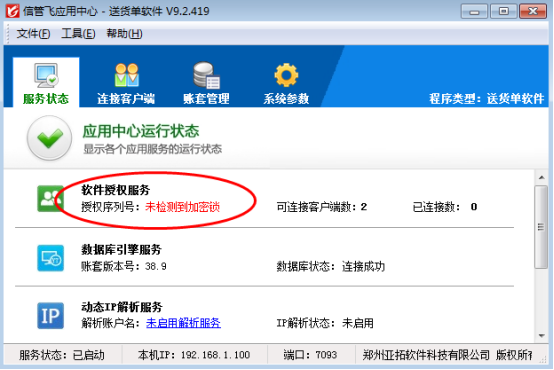 一、打开软件应用中心程序(红色图标),可先查看服务状态下的“软件授权服务”,如果授权序列号显示“未检测到加密锁”,如下图所示: