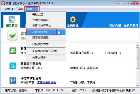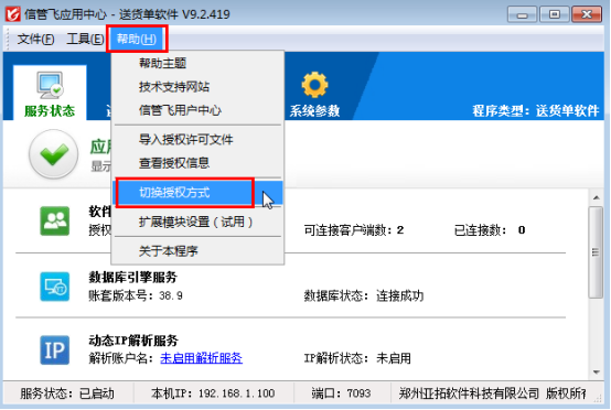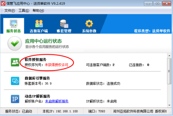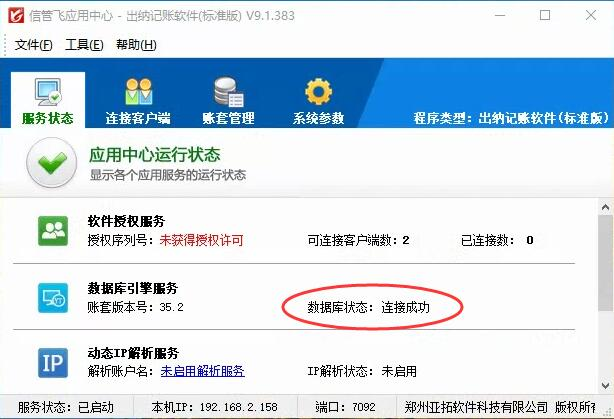 信管飞应用中心退出后请重新运行信管飞应用中心程序,应用中心启动后,请检查服务状态是否已启动正常,软件授权服务是否显示正常及数据库状态是否连接正常,正常状态如下图所示,服务状态显示正常,请尝试重新登录软件。
