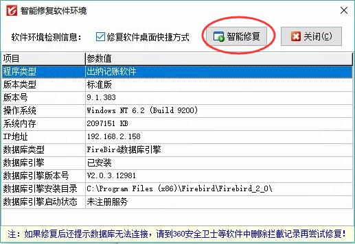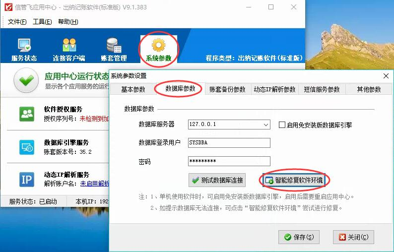 在软件应用中心程序中,点击“系统参数”->“数据库参数”打开数据库参数配置界面,然后点击“智能修复软件环境”按钮打开智能修复软件环境界面智能修复软件环境即可,如下图所示(或者在软件应用中心程序中点菜单“工具”->“智能修复软件环境”同样可以打开智能修复软件环境界面智能修复软件环境)。