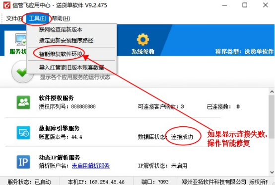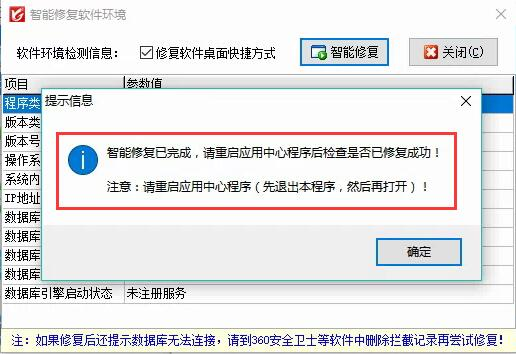 如智能修复软件环境完成后,重启应用中心程序数据库状态仍显示为连接失败,请联系我们在线客服解决。
