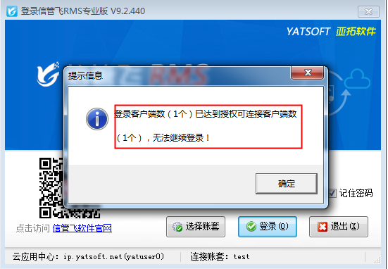信管飞所有软件都支持云账套服务模式,数据存在云服务上,本地只要有网络就可以登录客户端程序连接数据使用,云账套模式是按用户数进行收费使用的,经常有客户反映登录其它电脑客户端的时候提示“登录客户端数已达到授权可连接用户数,无法继续登录”,如下图所示。为了可继续使用,软件支持可直接操作“断开连接”,本文以信管飞RMS软件为例进行示范。