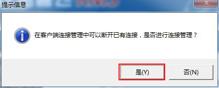 出现授权达到最大用户数提示后,点击“确定”按钮,可以看到提示信息“在客户端连接管理中可以断开已有连接,是否进行连接管理”,点击是进入下一选择,如下图所示: