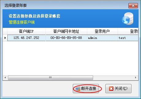点击“是”,进入管理连接客户端界面。可以选择当前登录的连接,点击“断开连接”,可断开当前已登录的客户端程序,然后可以重新登录。如下图所示: