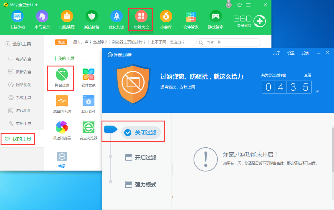 打开360安全卫士,在“功能大全”—》“我的工具”内找到“弹窗过滤”工具打开弹窗过滤器,点击“关闭过滤”即可。