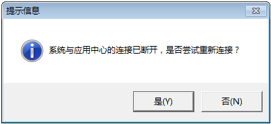 第一种解决方式:鼠标双击软件界面最下方的“连接状态:已断开”字样,系统会弹出“系统与应用中心的连接已断开,是否尝试重新连接?”提示信息,如下图所示,点“是”按钮,客户端程序会尝试重新建立与应用中心程序的连接。如果连接成功即可打开相应的功能,继续使用软件。