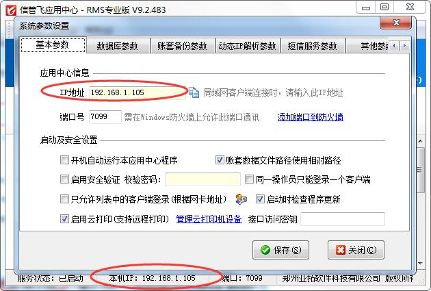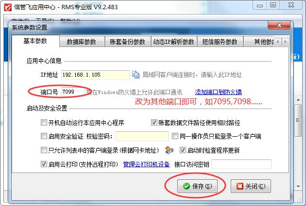 修改通讯端口的方法也很简单,在“信管飞软件应用中心”程序中,点“系统参数设置”中基础参数中修改端口号为其他未使用的端口即可,比如7098、7097、7096...,修改保存参数后,需重启“亚拓软件应用中心”程序,以便使配置生效。同时,客户端程序登录的时候,也要使用新的端口(方法:在登录窗口,点“选择账套”按钮,输入新的通讯端口号)。
