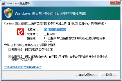 首次运行应用中心程序,如果防火墙弹出提示窗口,则Win7系统请点击“允许访问”按钮允许访问(专有网络不需要打勾选择);WinXP系统请点击“解除阻止”按钮即可。