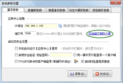 主机电脑的Windows防火墙或其他安全软件的防火墙上需要开放相应的端口,软件支持自动添加防火墙规则。在应用中心程序点“系统参数”可以设置自动添加端口到防火墙。