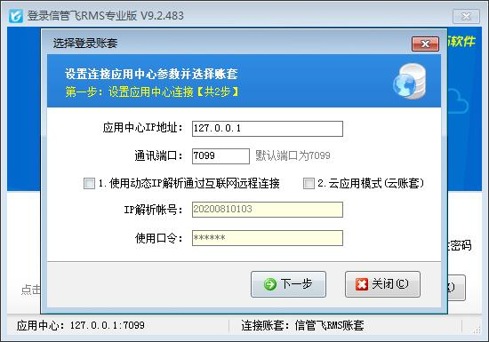 点击桌面上的“信管飞RMS”程序(以下简称“客户端程序”)图标(或者在开始菜单中点击程序组中的相应功能),即可打开客户端程序。点“选择账套”按钮,可以输入“应用中心”所在电脑(即主机电脑)的IP地址以及通讯端口,如果是通过互联网远程连接请输入购买动态IP解析服务后我们提供的IP解析帐号和使用口令,然后点“下一步”按钮,选择要登录的账套。