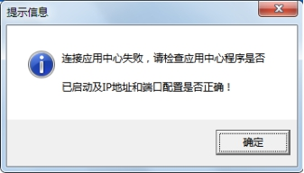 部分用户有时在登陆软件时会提示“连接应用中心失败,请检查应用中心程序是否已启动及IP地址和端口配置是否正确!”,如下图所示。