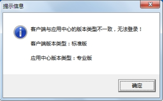 ③如果登录的时候提示如下信息,则表明客户端程序的版本类型与主机电脑上的应用中心程序的版本类型不一致,请使用相同版本类型的程序登录即可。