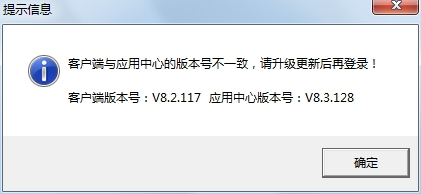 ④客户端程序登录的时候,如果发现与主机电脑上的应用中心程序版本号不一致,会提示如下信息,用相同版本的安装程序安装一下即可。