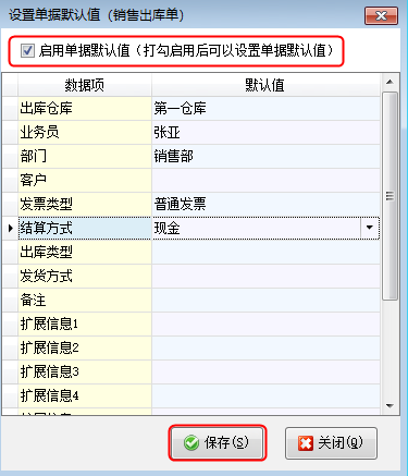 在“设置单据默认值”窗口,勾选“启用单据默认值”,选择需要设置的默认值后点击“保存”按钮进行保存。再次新增销售出库单时,单据主体上面会直接显示设置好的数据项默认值,如图4所示。