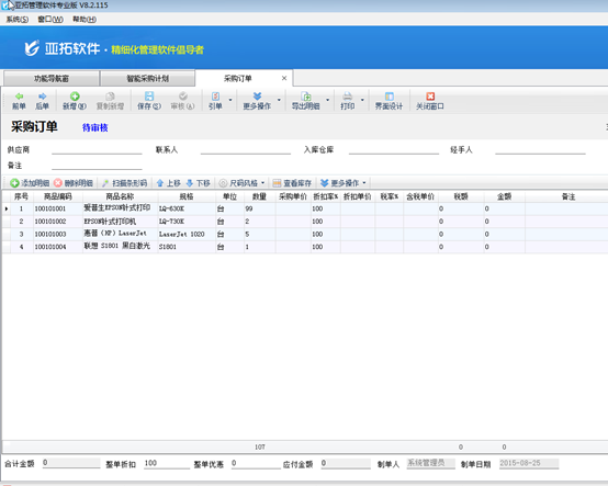 (3)生成单据:勾选需要的采购的商品记录,点“生成单据”按钮,软件会将列表中“计划数量”不为空的记录生成为采购订单。由智能采购计划生成的采购订单如下图所示: