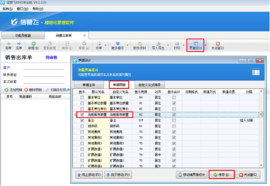 首先打开销售出库单开单界面,如下图所示,软件默认不显示“赠品”项,需要先通过界面设计配置将“赠品”项勾选显示出来。在工具栏点击“界面设计”—》“单据明细”,找到“赠品”项,将其勾选显示出来,然后点击“保存”按钮保存设置。